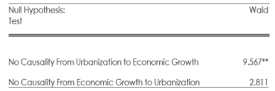 In the presence of the mixed order of integration between the series, the TY method is proper as the modified Wald test statistic that follows the asymptotic distribution. Hence, we motivated to apply this method in order to identify the casual link between the economic growth and urbanization rate in US. However, defining the optimal lag order of the model for estimation is also matter of significance. To this end, we select the lag order of 3 (𝑝 = 3) based on the Schwarz Information Criteria (SC) since this criterion chooses the most parsimonious model comparing to the sample size. The results are displayed in the following Table.