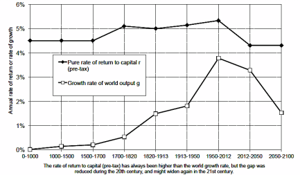 Figure 1. Rate of Return versus growth rate at the world level, from Antiquity until 2100 (Piketty 2015: 354).