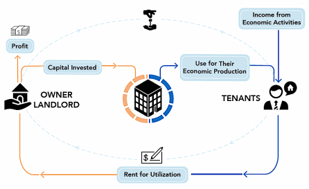 Within this methodological perspective, it is perhaps surprisingly found that the existing, neoclassical economic concept of long-term, commercial (non-residential) real estate investment is such that it is fundamentally structured on a certain duality of capital flows: divided into the portion of the whole economic benefit that is attributable to the actual utilization of the property in spatially accommodating production activities by tenants such as manufacturing, office work, retail, etc.,,as distinct from that portion of benefit which is due the storing (and desired increase) of investment asset value which is derived predominantly from the sale of the property.