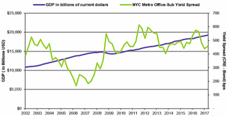 Figure 3: New York City Office – Suburban market Yield Spreads generally tracked around general Gross Domestic Product growth between 2002 and 2017, with some expected aberration during the excessive boom and bust occurring 2006-2009 and a correlation coefficient 0.34. RCA data.
