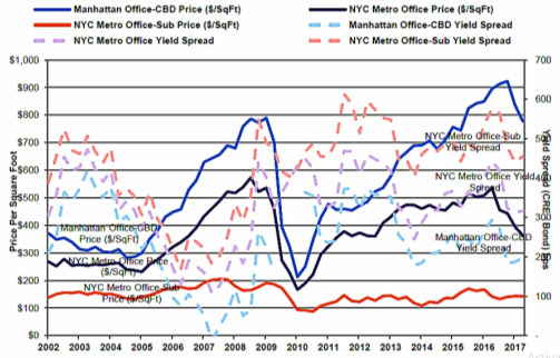 Figure 4. The correlations between Prices and Yields on office properties in the Manhattan CBD, NYC Metro Office, and NYC Metro Office–suburban areas. RCA data
