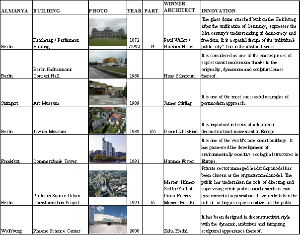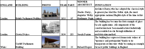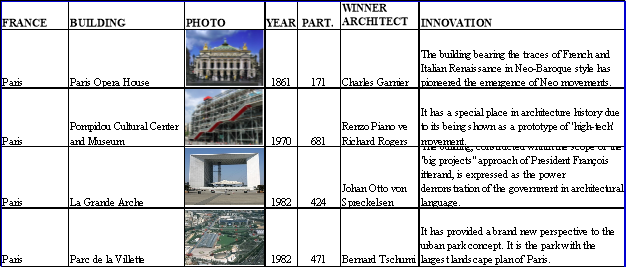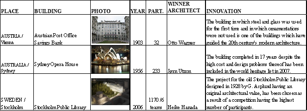 The selected buildings obtained through competitions and known as important examples of architecture and urbanism history by the innovations they have brought and the countries where they are located in are mentioned in the following tables (Tables 1 to 5).