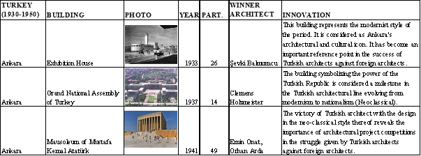 The principle of taking the modern cities of Europe as model and thus achieving the level of contemporary civilizations was adopted in the development of cities within the newly established Republic of Turkey in this period. Architectural project competitions organized for the prestigious public buildings of the newly established state has become a means of expressing the ideals of the state while also being an important means of directing designers. Initially important public buildings were designed through "international competitions" and by virtue of foreign architects. Subsequently, important buildings and urban areas started to be projected through "national competitions" upon the successes of the Turkish architects in the later periods. The most important approach of the period was the desire of spreading the architectural culture throughout the country by virtue of competitions (Özbay, 1993). Outstanding projects of this period are specified below.