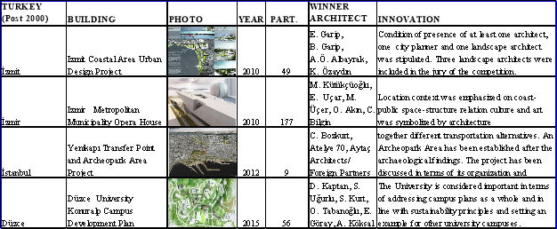 Issues such as the conditions in which the designs are prepared, the place of the designs in social, political and cultural contexts specific to that place and the actors of the competitions and significant effects of discussions made on these issues on the architectural and urban environment of the country have been observed in the examined world samples of competition projects.